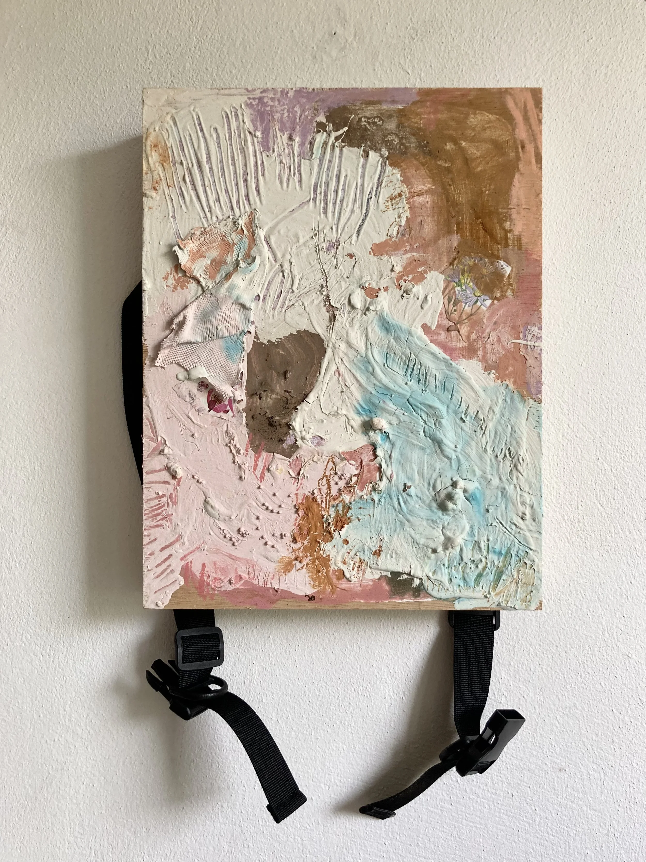 Untitled, 2022, 23 x 30 x 4cm, House paint, rust, clay, hundreds and thousands, children’s clothes, felt tips, hot chocolate, mushroom compost, crushed snail shells, probiotics, crushed thyroxin, vinegar, pastels, food colouring, pages from book, seeds, petals, watercolour on wooden box full of dust, non-recyclable rubbish, dried flowers with rucksack straps.